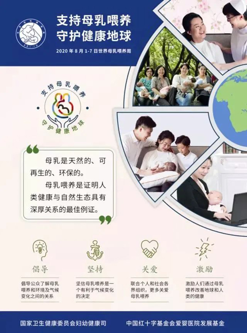 2020年8月1日至7日是第29个世界母乳喂养周,今年的主题是:支持母乳喂养,守护健康地球。强调的是倡导和推进全社会支持母乳喂养,保障儿童健康,同时通过减少母乳代用品的消费和使用,从而减少相关生产和消费环节对地球的污染和对资源的消耗。