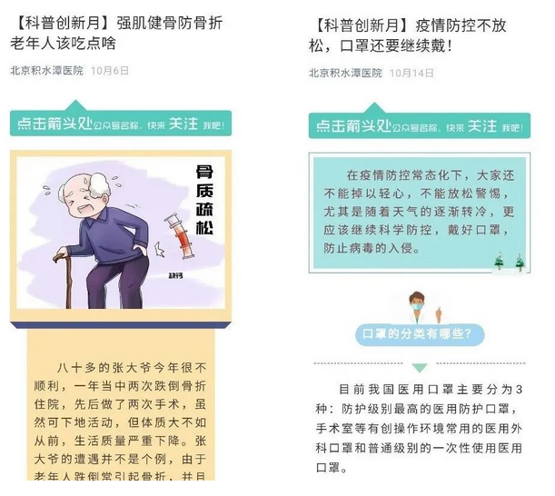 截止目前,医院共收集科普文章46篇,已推出33篇,内容包括老年骨质疏松预防、儿童内科常见病预防、内科病等诸多方面,11月、12月将根据宣传工作需要陆续推出其余科普作品。