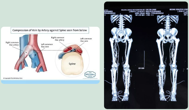 其中两个最主要的原因一是由于髂总静脉受压狭窄甚至闭塞造成静脉回流受阻(左图),另外一个重要原因就是因为患者得了下肢深静脉血栓后没有及时给予正确的治疗、从而造成了下肢静脉血栓后的远期并发症。(右图)