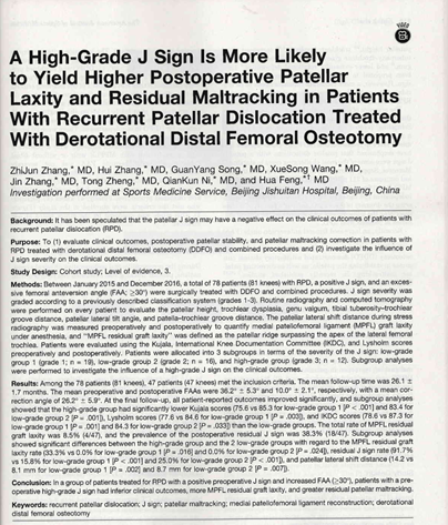 2020年1月,张志军大夫发表题为《A High-grade J sign is more likely to yield higher postoperative patellar laxity and residual maltracking in recurrent patellar dislocation patients treated with derotational distal femoral osteotomy and combined procedures》的文章。该研究采用回顾性队列研究的方法分析了股骨远端去旋转化截骨术在治疗伴有髌骨运动轨迹不良(J形征)的复发性髌骨脱位患者的临床疗效,并提出术前高度J形征是造成该术式术后临床疗效不佳的独立危险因素。