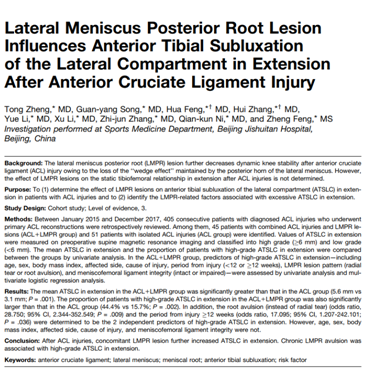 2020年3月,郑峒大夫发表题为《Lateral Meniscus Posterior Root Lesion Influences Anterior Tibial Subluxation of the Lateral Compartment in Extension after Anterior Cruciate Ligament Injury》的文章。该研究以“外侧半月板后根部损伤”这一特殊类型的半月板损伤为切入点,以队列研究的方法,回顾性分析了合并该损伤患者在前交叉韧带损伤后胫骨前移的变化趋势。研究结果显示外侧半月板后根部损伤会进一步加剧前交叉韧带损伤后胫骨前移程度,为外侧半月板后根部损伤的治疗策略提供了临床依据。