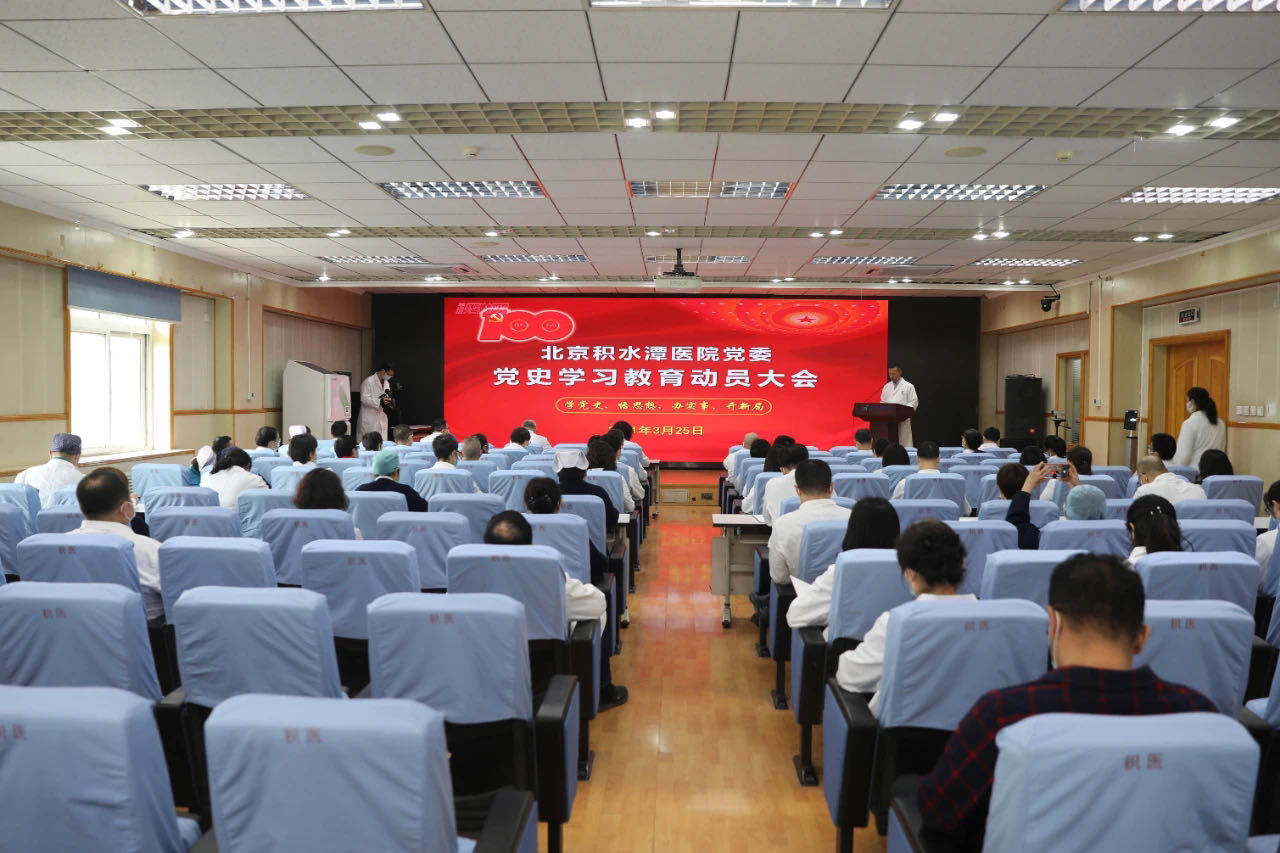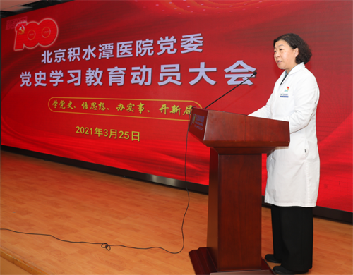 3月25日下午,北京积水潭医院党委召开党史学习教育动员大会,动员部署党史学习教育工作。医院全体党政领导班子成员、党支部书记、支委、中层干部和党员代表在两院区报告厅实时视频连线参加大会。党委书记李玉梅作动员讲话。