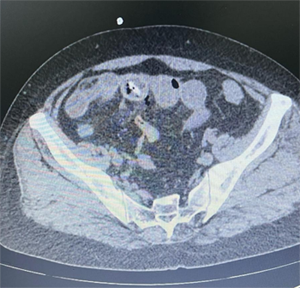 原来,老人当天凌晨突然出现了下腹部疼痛,并持续加重,继而出现发热症状。按照就诊流程,首先就诊于回龙观院区发热门诊,排除新冠肺炎的可能。老人腹部CT检查提示,小肠可见高密度影,并已穿破肠壁,周围有异常气体影,肝周和盆腔可见积液。医生再次追问病史,老人讲述近几日进食了大枣,但已记不清而是否将枣核也一并吞下。了解病情后,柏楠主任医师、吴全副主任医师和崔爱民主治医师果断决定完善相关术前检查,收入院给予急诊手术治疗。