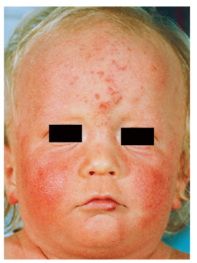又叫“婴儿湿疹”。约50%的患者1岁以内发病,以出生后2个月内为多。初发时为面颊部瘙痒性红斑,继而在红斑基础上出现针尖大小的丘疹、丘疱疹,密集成片,皮损成多形性境界不清,搔抓、摩擦后很快形成糜烂、渗出和结痂等,皮损可迅速扩展至其他部位(如,头皮、颈部、腕部、四肢等),约85%左右的婴幼儿可以在1岁左右好转、痊愈,部分患者病情迁延并发展为儿童期AD。