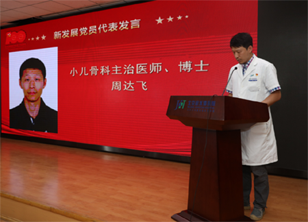 各位领导、各位同事,大家好,我是小儿骨科的周达飞。今天非常荣幸地在这里代表32名新党员发言,心情无比的激动。首先,我代表新党员感谢党组织对我们的信任、教育和培养,也要感谢老党员们对我们的关心和帮助,这将是我们人生道路上的一个新起点,它将对我们今后的工作、学习和生活产生深远的影响,会更加激励我们不断地努力进取。