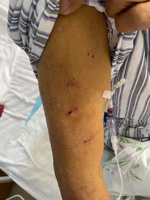 黄疸患者发黄的皮肤和因瘙痒导致的抓痕