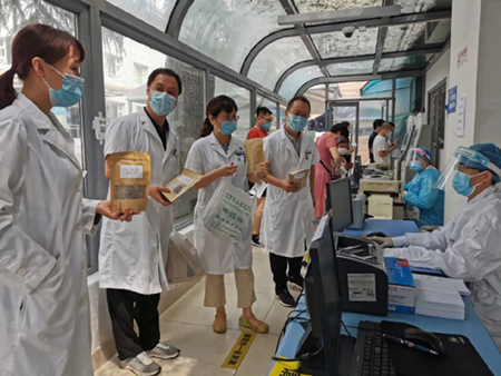 院团委副书记果爽和中药营养党支部书记许保海主任、营养科赵霞主任、临床试验机构陈志刚主任一起来到新街口院区第一核酸检测点和急诊分诊台,为奋战在抗疫一线的职工们送上消暑药茶