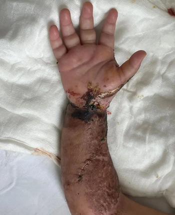 孩子的离断平面位于腕关节水平,离断肢体的外观完整,但肌腱及神经血管都撕脱严重;前臂皮肤挫伤严重,可见清晰的轮胎印,断端污染,无活动性出血,初步判断具备再植条件。紧急联系当天值班住院总医师黄行健、二线李斌主治医师及三线杨勇主任医师,组成急诊治疗小组。