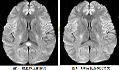 患者于当晚完成了头颅磁共振检查,果然在胼胝体压部见到了异常高信号(在T2、FLAIR、DWI等序列,胼胝体压部显示卵圆形高信号),随后的病原学检查也显示乙型流感病毒抗体IgM阳性。自此,RESLES诊断明确。经过抗病毒、脱水降颅压、营养神经、激素等综合治疗后,患者头痛迅速缓解,间隔8天后复查脑MRI胼胝体压部高信号消失,复查腰穿颅压恢复正常,脑脊液细胞数基本正常,右眼球活动也逐渐恢复,复视消失。