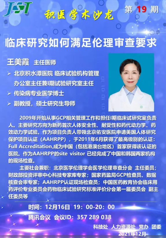 12月16日,我院第19期学术沙龙如期在线上举行。本期学术沙龙邀请的嘉宾是:我院临床试验机构管理办公室主任兼Ⅰ期试验研究室主任王美霞。院学科新星、学科骨干、轮转医师及研究生等140余名人员全程在线参加。此次沙龙由团委书记王含主持,科技处处长于洋及多位科室主任在线关注。