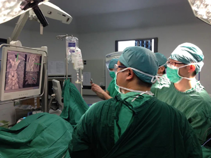 治疗上多数患者需行寰枢椎融合术以恢复其稳定性。寰枢椎后路内固定技术因手术可视性强、植骨融合率高等优点已广泛应用于寰枢椎不稳的治疗。然而,颅颈交界区畸形患者与其他寰枢椎不稳患者最大的不同在于其寰、枢椎发育情况较为复杂,常常合并发育畸形、骨质发育不良、骨质缺如等情况,另外,椎动脉走形异常也较多见;由于寰枢椎发育畸形导致的局部解剖标志不明确,术者几乎无法根据术中解剖位置明确准确的进钉部位以及方向,术中可能导致严重的并发症出现,特别是椎动脉损伤的风险较高,近年来,我科利用术中导航技术,通过动态显示脊柱的精确三维结构,术中根据实时、动态影像及时调整螺钉进针角度和方向,极大的提高了手术的安全性。