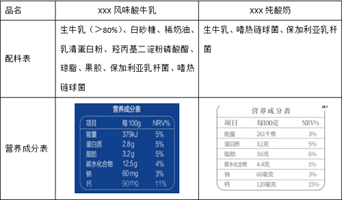 举个例子,风味酸牛乳vs纯酸奶,两者都是以生牛乳为原料经发酵后制成的PH值降低的产品(俗称酸奶),前者在名称前附加短语“风味”,说明是以80%以上生牛乳为原料,添加其他原料制成的产品。如表格所示,在营养成分上,前者因生牛乳添加量少于后者,蛋白质和钙的含量略低,又因添加了白砂糖,碳水化合物要高于后者,血糖异常者最好选择后者。但需要提醒一下,因为后者未添加任何甜味剂,口味上要稍逊于前者。