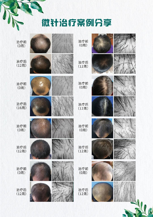微针疗法是一种透皮给药技术,适用于雄激素性脱发,稳定期斑秃,休止期脱发等各种类型的脱发,微针疗法快速起效,操作简单,安全性高,微针在头皮的深度一般只有0.3-0.8mm,10-15分钟即可完成一次治疗。经过12周的治疗,看到茂密的头发又长出来,您心动了吗?