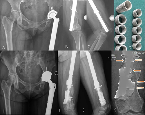 女,45岁,左股骨近端骨肉瘤行左股骨近端切除+左股骨近端肿瘤假体置换术后14年,可见假体松动下沉,采用沉管多孔金属圈(D)重建内壁后,患者目前随访3年余,假体固定良好,断层造影箭头指示处(K)可见多孔金属圈有骨长入,临床效果满意。