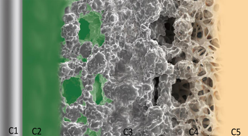 ▲混合固定示意图,C1为骨水泥假体,C2为骨水泥层,C3为多孔金属圈的实心层,C2和C3之间示意有骨水泥渗入金属圈多孔层,C4示意骨小梁长入金属圈的多孔层获得生物固定,C5为皮质骨髓腔面 (引自文献:Huang Y, Zhou Y, Shao H, Yang D, Tang H, Guo S. A Novel Endosteal Reconstruction of the Femur from Distal Femoral Remnant Using 3D-Printed Titanium Rings: A Two-Case Report. JBJS Case Connect. 2021 Aug 27;11(3). doi: 10.2106/JBJS.CC.20.01038. PMID: 34449452.)。