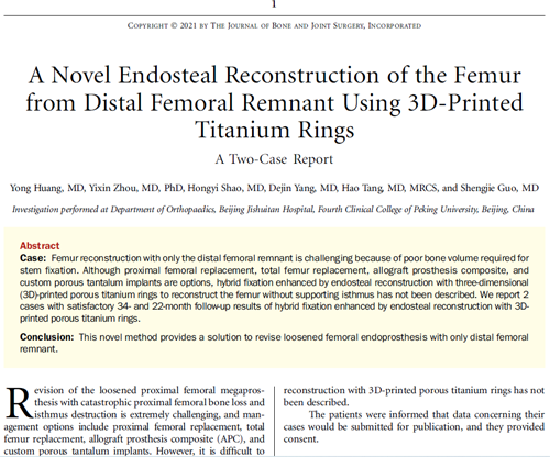 同时,周一新教授团队也将此项技术发表于骨科权威期刊JBJS Am,文章是一篇题目为“A Novel Endosteal Reconstruction of the Femur from Distal Femoral Remnant Using 3D-Printed Titanium Rings-A Two-Case Report”的病例报道,矫形骨科黄勇医师为该论文第一作者。本文详细介绍了“沉管”骨内壁重建技术以及相应的临床疗效。尽管该论文仅报道了术后经2-3年随访的2个典型病例,但是周一新团队已施行此类手术10余例,目前所有患者术后随访效果均满意。