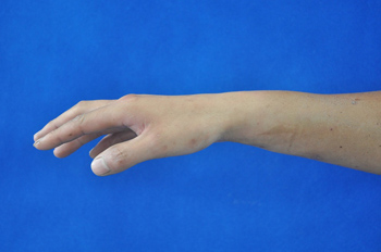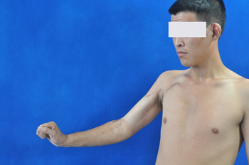 图1:术后1年,伸腕功能良好,由于尺侧屈腕肌保留,腕部动作平衡良好