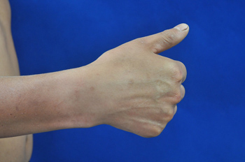 图2:术后1年,伸指功能大部分恢复,示指伸指力量稍差