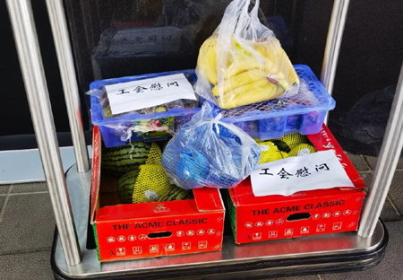 感谢钱组长对大家的关心,炎炎夏日,能够在大白装外加点冰贴降温、能够在辛苦工作之余每餐增加水果补充营养。更感谢医院工会老师和医务部的汪老师,为我们送来慰问瓜果,虽然因为管控要求不能见面,但这些关心和记挂都汇成了繁重生活里的一点甜!