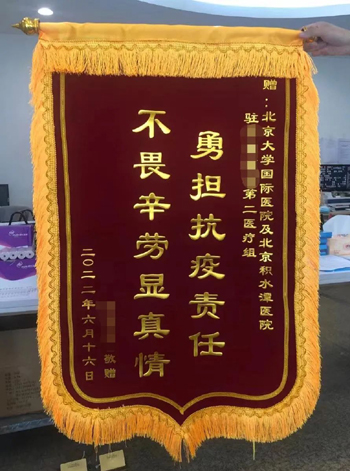 离开前,隔离人员给医疗团队送了一面锦旗:不畏辛劳显真情,勇担抗疫责任。锦旗上的每个字都蕴含着⼀份真情,是对我们工作的理解和感谢,更是对大家辛苦付出的肯定!回想我们所经历的一切,令这个夏天变得珍贵圆满!