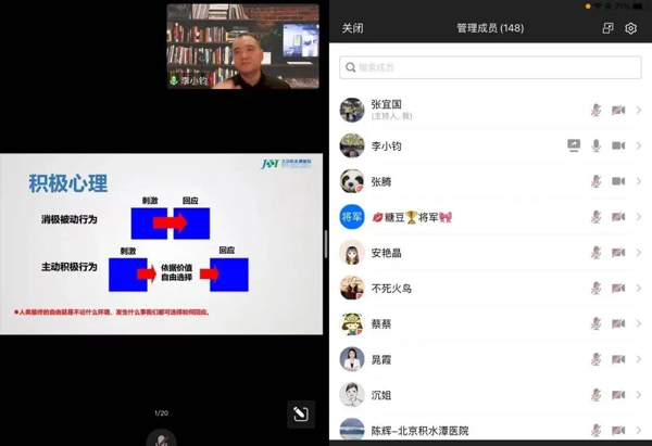 李小钧主任从什么是情绪和压力、情绪压力产生的诱因及管理目的、调节情绪的方法及情绪压力管理的主要目标等方面入手,结合医护人员工作特点,为职工们讲解了如何调节心理状态,以积极乐观的心态面珍爱生活、享受工作。近200名职工在线聆听了讲座,大家纷纷表示受益匪浅。