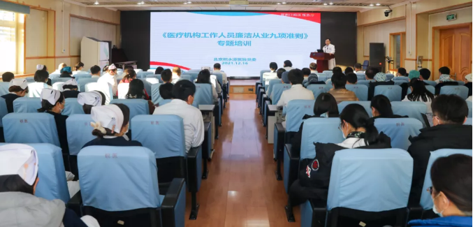 为增强全院工作人员责任感、使命感和荣誉感,规范执业行为,形成风清气正的行业环境,保障医院高质量发展,贯彻执行《医疗机构工作人员廉洁从业九项准则》,20211216日下午, 北京积水潭医院召开廉洁从业九项准则专题培训会。培训会由党委副书记、纪委书记吴国安主讲,全体院领导、中层干部、主任助理和护士长参加培训。