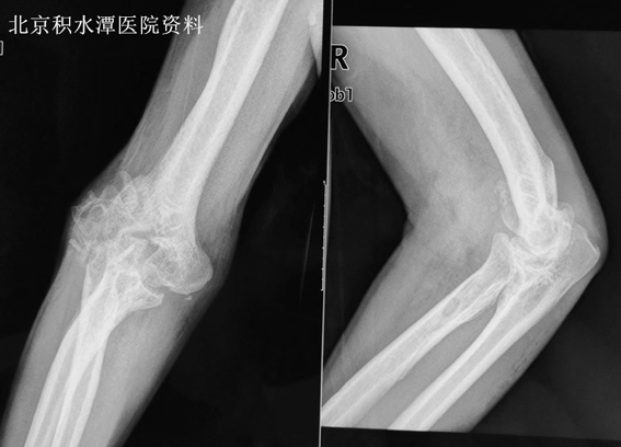 老张是位京郊农民,由于车祸导致肩胛骨骨折和肱骨髁间开放性粉碎骨折。当地医院为他进行了肩胛骨内固定手术,但因为肘部软组织损伤较重,未对肱骨髁间骨折进行治疗。9个月后,老张的肱骨远端破坏严重、畸形愈合,仅有10度的轻微活动度,疼痛更加明显。多个医院就诊后,医生都建议他到北京积水潭医院行全肘关节置换。