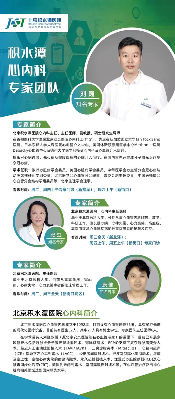 为满足新街口、龙泽地区广大骨科手术患者的术前评估需求,提供优质便捷有序的围手术期服务,北京积水潭医院心内科在新街口院区、新龙泽院区开设骨科手术术前心脏评估门诊,于2022年8月正式开放。