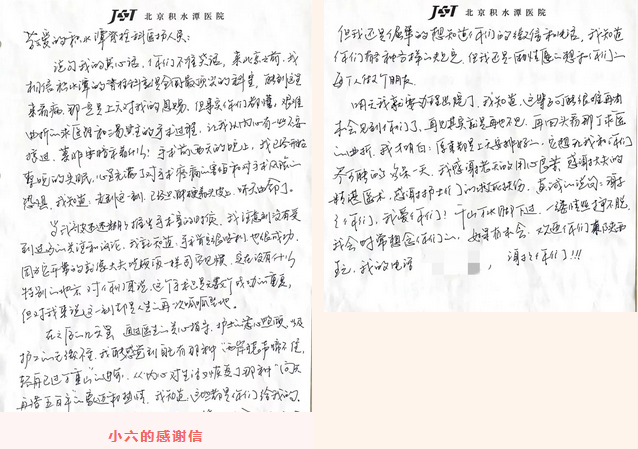 小六的手术终于安排上了。经过医护人员的精心治疗和护理,小六最终顺利出院。出院前,他递给了我们一封表扬信,信中说的每一句话都是他的肺腑之言和最诚挚的感谢。他说:“手术对于我来说就是人生的再次呱呱坠地” “做完手术内心对生活又恢复了那种向天再借五百年的豪迈和热情”……虽然这是一封简短的表扬信,但它不仅承载了患者的感谢,更是医患情深的缩影,是对脊柱外科医生精湛、过硬的手术的赞扬,也是医院感人事迹中的小小一幕。