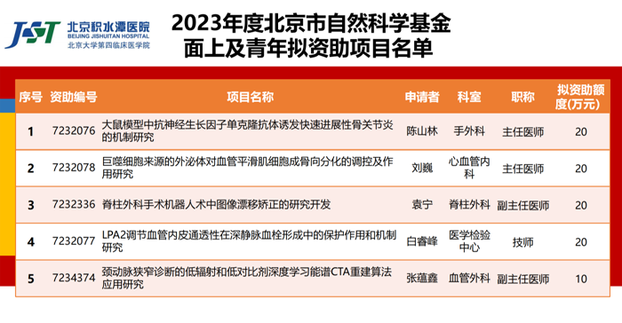 北京积水潭医院获得五项“北京市自然科学基金面上及青年项目”拟立项资助