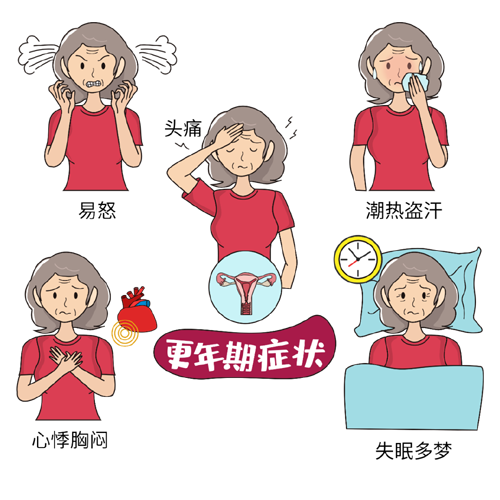 ① 绝经相关症状:月经紊乱、潮热、多汗、睡眠障碍、疲倦、情绪障碍(如易激动、烦躁、焦虑、紧张、低落)等。