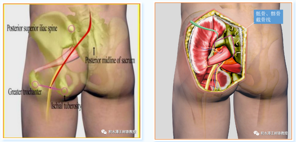 图2:左图:红线标记处是坐骨大孔截骨的部位。