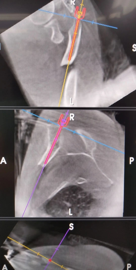 据了解,这名患者是在骑电动车时不慎摔倒,双手着地,致双肩部疼痛伴活动受限。患者伤后来我院急诊就诊,结合病史、查体及X线片检查,确诊为双侧锁骨骨折。急诊进行锁骨带固定后,患者住院手术治疗。手术中,专家团队在肩峰固定示踪器,术中三维CT规划弹性髓内钉入钉点及方向。在机器臂引导下精准选择最合适的入钉点,复位满意后,置入3.0弹性髓内钉。术后患者恢复良好。