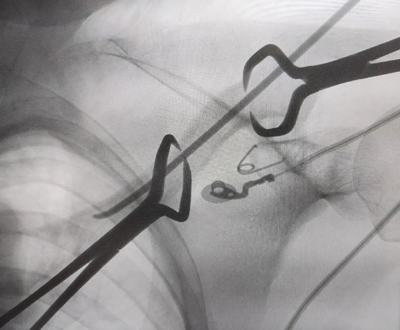 ▲术中透视显示复位良好,固定可靠,弹性髓内钉置入最佳位置