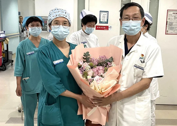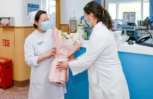 一束束亮丽的鲜花伴着一声声温暖的问候递到护士手中,代表着院领导对护士的关爱之情。