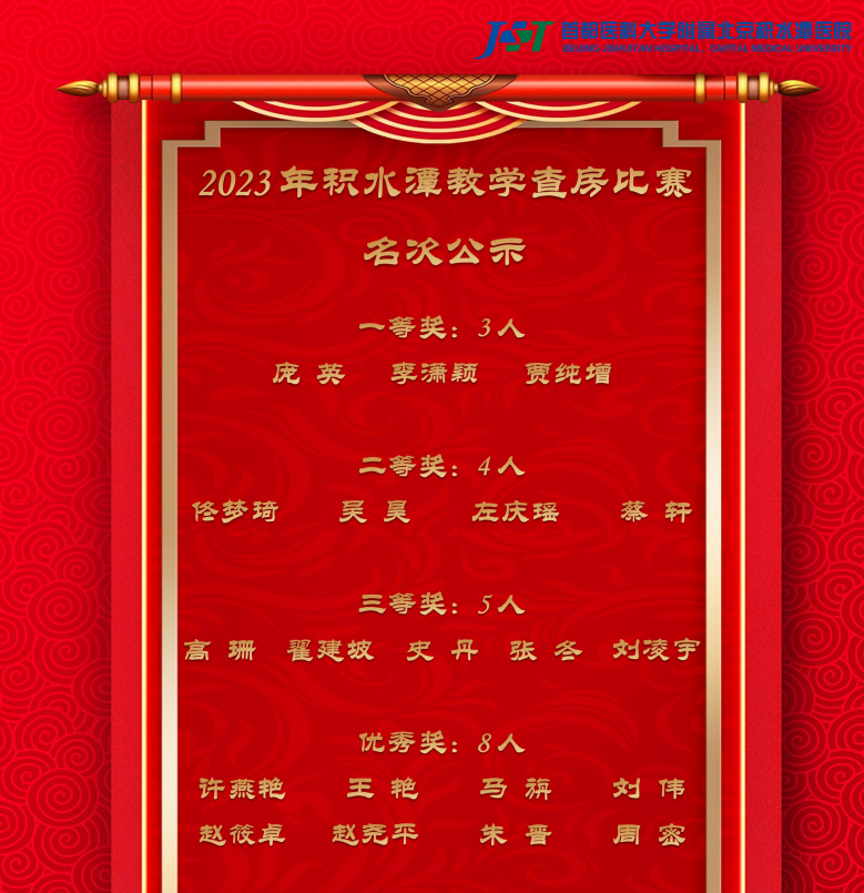 为进一步规范住院医师规范化培训(以下简称“住培”)教学查房流程,全面提高指导医师教学能力和责任意识,展现住培师资教学风采并调动住培医师积极性,近日,北京积水潭医院教育处举办的住培教学查房比赛圆满结束。经过激烈角逐,最终评选出了一等奖3名,二等奖4名,三等奖5名和优秀奖8名。