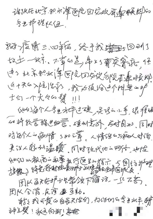 接过信,我才得知,原来林女士是一位美国华侨,从加州理工大学毕业后,定居在洛杉矶已有30年了。在美国,她每次生病输液时,都十分抵触,护士难扎准血管,自己也很受罪,医患双方都很为难。这一次,她见识到了中国护士的操作技术。她说道,这次是回国探亲,不幸患病,才有机会来到北京积水潭医院耳鼻喉科就诊治疗,为护士们优质的服务和超强的技术能力感到赞叹。听完林女士的话,我的内心充满了感动与自豪。