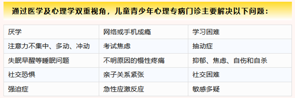 通过医学及心理学双重视角,儿童青少年心理专病门诊主要解决以下问题: