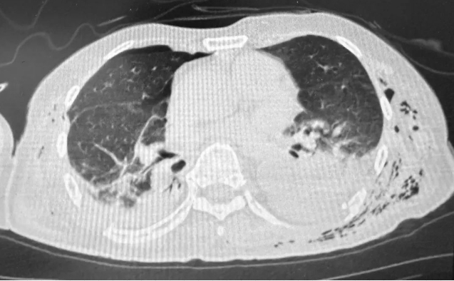 急诊科迅速为老张完善一系列检查。复查胸部CT显示,老张的胸部双侧有大量的创伤性血气胸,右侧第1-8肋骨及左侧第1-11肋骨骨折,双肺挫伤伴有膨胀不全,纵膈、颈部及胸壁皮下广泛气肿。软化的胸壁及大量的血气胸等危重情况,随时可能造成严重的呼吸循环障碍,生命危在旦夕。