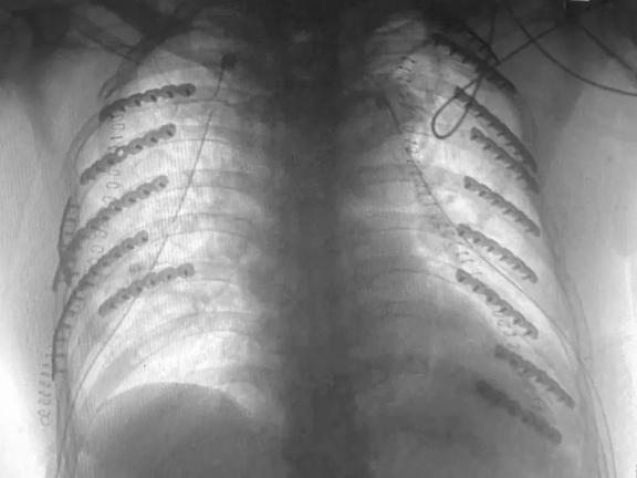 为争取手术时机,胸外科主任张强及张冬医师紧急协调,在入院当天为老张进行了急诊手术治疗。术中,患者双侧胸腔内吸出近2000ml的陈旧性血液,探查胸腔发现,双侧肺组织多处挫裂伤。手术团队将患者受损后没有功能的肺组织进行了切除,同时通过肋骨内固定,重建其双侧塌陷的胸壁。时间一分一秒地在流逝,此时已是凌晨,历时近7个小时,手术团队通力协作成功将老张从“死神”手中拉回来。
