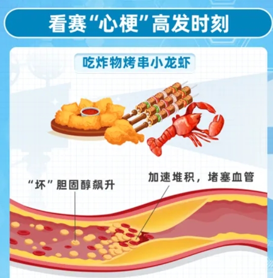 夏天看比赛怎么少得了炸鸡、烧烤、小龙虾等美食,但殊不知,这些高油高脂食物,会直接升高血液中“坏”胆固醇,从而加速血管堵塞。
