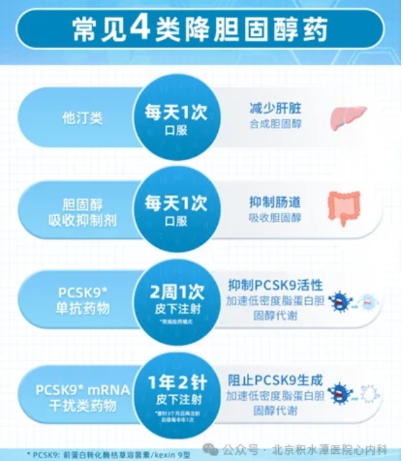 他汀类、胆固醇吸收抑制剂、PCSK9单抗、PCSK9 mRNA干扰类药物。