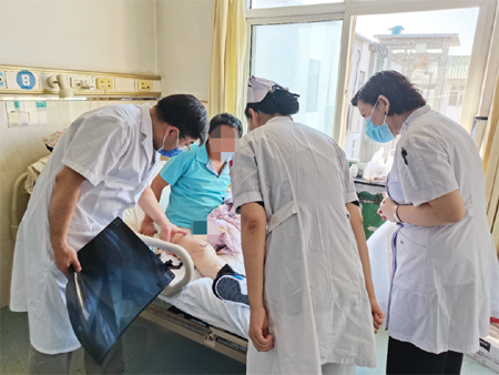 创伤骨科党总支书记朱仕文带领党员王金辉主任医师、张权主任医师,护士长张春玲、姜耀参加延庆永宁社区卫生服务中心义诊活动,3位医生共接诊30余位患者。得知外科病房有患者需要床旁会诊,朱仕文和张春玲、姜耀马上赶往病房。患者60岁,老年男性,10天前车祸致伤。详细了解患者本次就诊情况后,朱仕文仔细观察患者右大腿外伤伤口,发现右侧患肢较左侧肢体明显肿胀,胫前指压性水肿,初步判断为下肢血栓形成。紧急联系本次义诊的我院超声科及血管外科专家后,患者被诊断为右下肢静脉血栓形成。当即决定转往上级医院进行进一步治疗,确保了患者得到及时有效的救治。张春玲、姜耀还与社区卫生服务中心的医护人员进行了针对性的护理专业讲解和指导。
