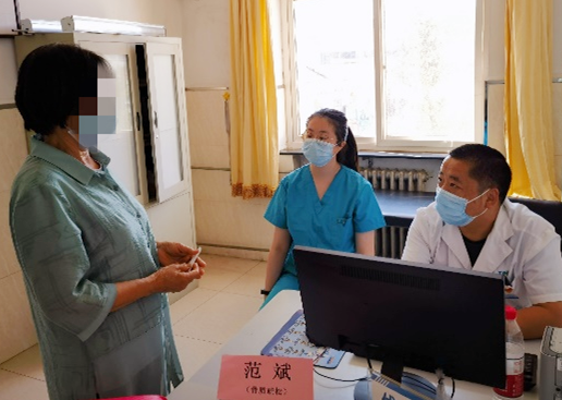 干部科党支部由支部书记田巍带队,张兴坤,范斌,李潇颖,张保振共5名医生分别参加了呼吸内科,神经内科骨质疏松科内分泌科的相关诊疗。由于当地群众医疗保健意识不够,慢阻肺,哮喘,慢性咳嗽等患者较多,田巍刚到诊室,就被当地患者团团围住。她耐心地给每位患者解释病情,查体,分析化验结果。永宁社区卫生服务中心是以糖尿病为特色诊疗的社区中心,内分泌是张保振的擅长专业。他除了接诊糖尿病患者,还深入到病房给住院的患者进行检查。范斌擅长骨质疏松专业。在义诊过程中,他及时地发现了当地多例严重骨质疏松合并椎体骨折患者,并为这些患者写下了详细地治疗建议。当地老年患者心脑血管疾病也十分常见,李潇颖在诊室耐心回应着每位患者的问题,并为患者制定个性化诊疗方案,辛苦之余,她说:“虽然自己累点,但是给这么多患者解决了问题,作为一名党员,感到非常光荣。”