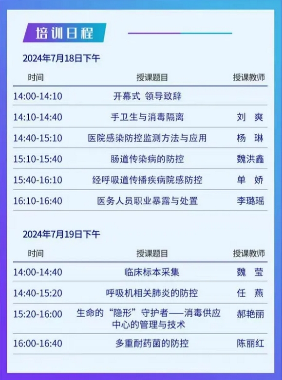本次培训中,北京积水潭医院感染管理处、医学检验中心及消毒供应中心的多名专业骨干进行授课。医院感染管理处处长助理任燕围绕呼吸机相关性肺炎的发生机制、诊断标准、诊断思路和集束化防控方案从院感专职人员的角度进行了学术探讨,并分享了日常工作中关于呼吸机相关肺炎的困惑和思考;消毒供应中心总护士长郝艳丽以“生命的‘隐形’守护者——消毒供应中心管理与技术”为题,从器械回收、清洗、消毒、保养、灭菌等10余个操作环节入手,图文并茂的对消毒供应中心工作做了全面介绍,生动地展示了精细化、专业化的消毒供应中心助力医疗机构高速运转的过程;医学检验中心魏莹老师从检验工作角度,围绕临床标本的采集时机、部位、方法、保存、转运、优先处理原则等进行了全方位解读,阐述了高质量的标本对于提高培养阳性率和准确性,对临床诊疗提供更有价值的检验结果的重要意义。医院感染管理处刘爽、杨琳、魏洪鑫、单娇、李璐瑶和陈丽红分别围绕手卫生与消毒隔离、医院感染防控监测方法与应用、肠道传染病的防控、经呼吸道传播疾病医院感染预防与控制、医务人员职业暴露与处置以及多重耐药菌防控等院感工作内容展开讲解。