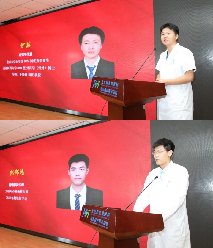 首都医科大学2024级外科学(骨外)博士伊喆,2024年新入职骨科轮转医师郭邵逸先后代表研究生和规培新学员发言。