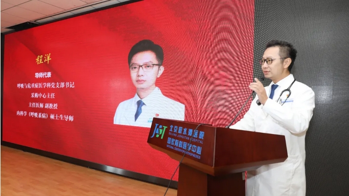 呼吸与危重症医学科党支部书记、主任医师,采购中心主任程洋,作为导师代表进行发言。他勉励同学要尊师重道,敬畏生命,博学笃行,创新进取。导师们作为学生坚强的后盾,将与同学们携手同行,共创未来。