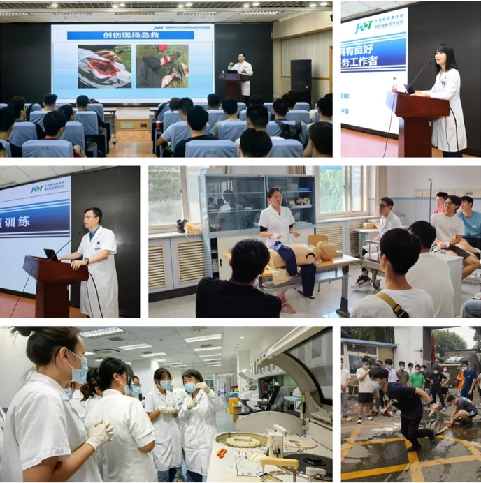 为了使新生更好地投入医院临床轮转阶段的学习生活,教育处在8月中下旬为同学安排了内容丰富、形式多样的入院教育课程和活动。在纪检办、医务部、院感处、医保办、医患办、药学部、护理部、信息中心、病案统计科、保卫处等职能部门和各临床医技科室和各专业基地的支持下,完成《临床岗位综合素质训练》和《临床通用技能训练》两门桥梁课的教学,开展全员“一警六员”消防培训和反诈培训,通过理论讲授与实践操作相结合的方式,让同学们在思想意识、规章制度、技能操作、心理调适等多维度适应新环境、新角色。