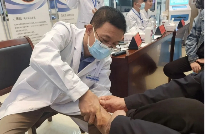 和张女士同样心怀感谢的患者还有很多。一位坐轮椅的老人在人群中焦急地排着队。他年轻时因工作原因脚部受到开放性损伤,当时进行了手术治疗。3年前因为足部有渗出破溃,到湖南等地医院进行皮瓣吻合手术,但今年开始足部活动受限,严重影响了生活。“我从网上特意了解过,积水潭医院骨科是中国最好的,家里人带着我从镇远县赶过来的。”老人的眼眶湿润了,他迫切地希望北京专家能够治好他的脚,为家里减轻负担。足踝外科主任医师李莹认真了解老人的病情,并邀请黔东南州人民医院疼痛科会诊,“我们会根据老人足部恢复情况,后续再考虑是否进行手术治疗,提高他的生活质量。”