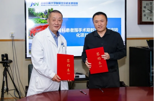 随后,会上进行了《骨科患者围手术期数字诊疗系统》转化项目的签约仪式,吴新宝作为项目负责人与乔岩进行签约并合影留念。